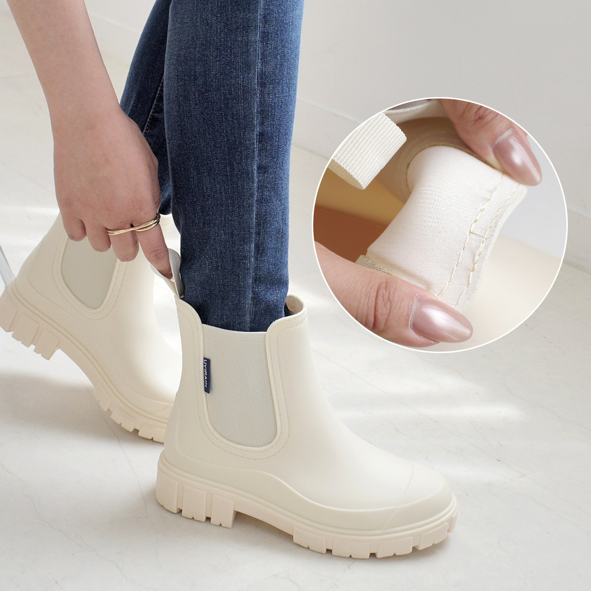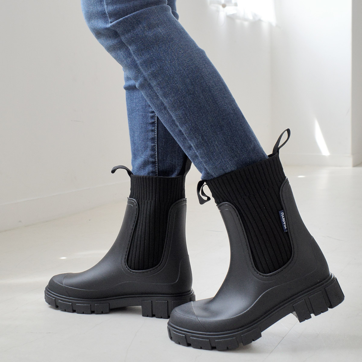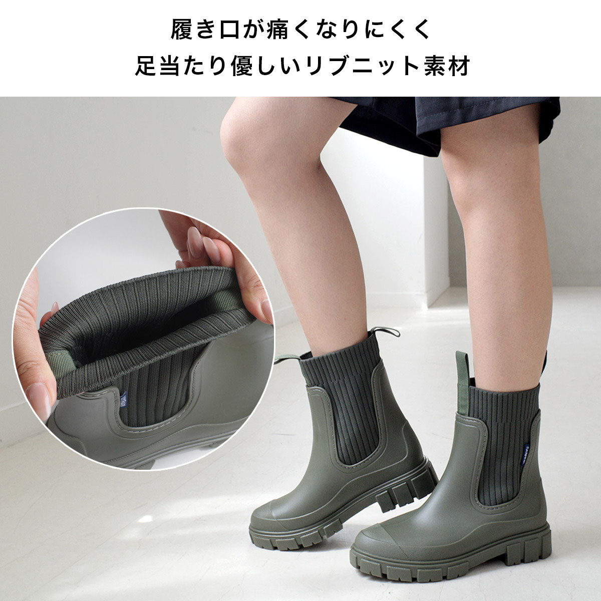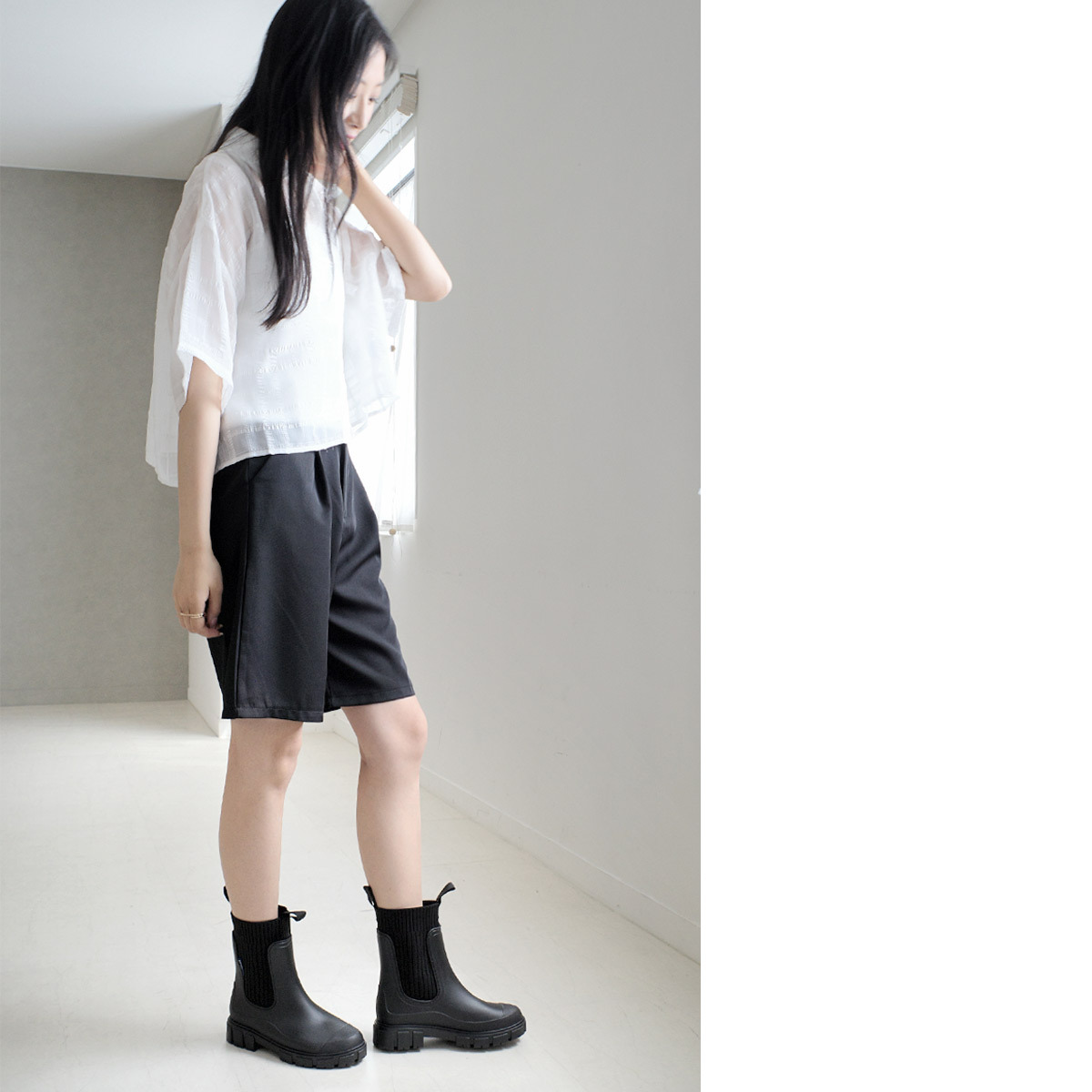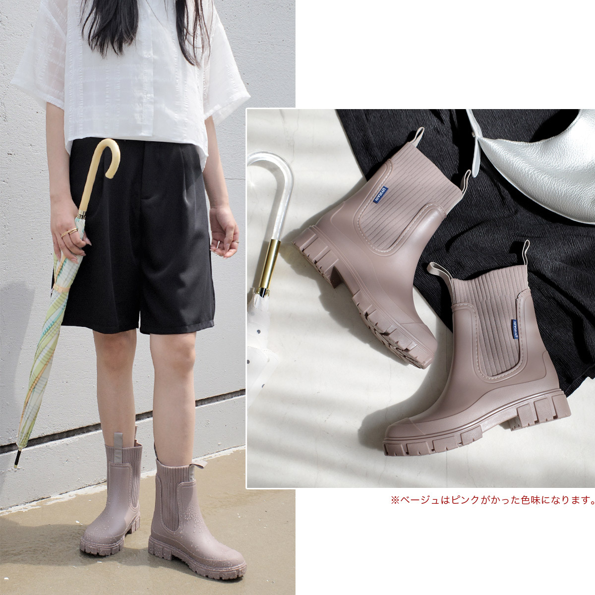 即使雨天也能時尚出門的側鬆緊雨靴。厚底粗鞋底設計,實現修身效果與流行感兼具。