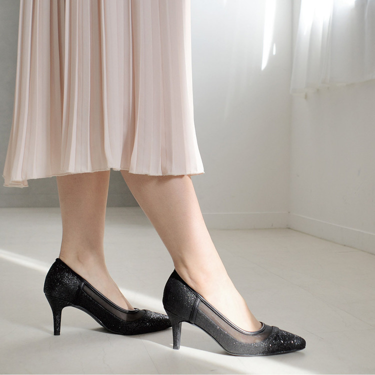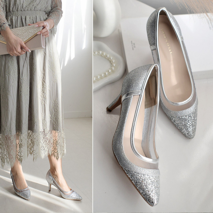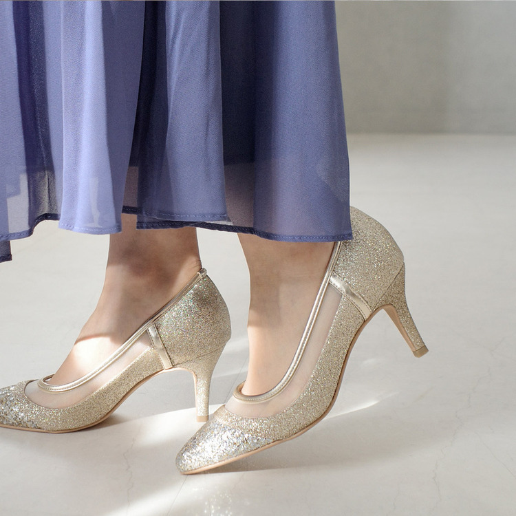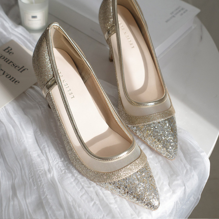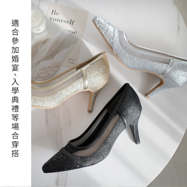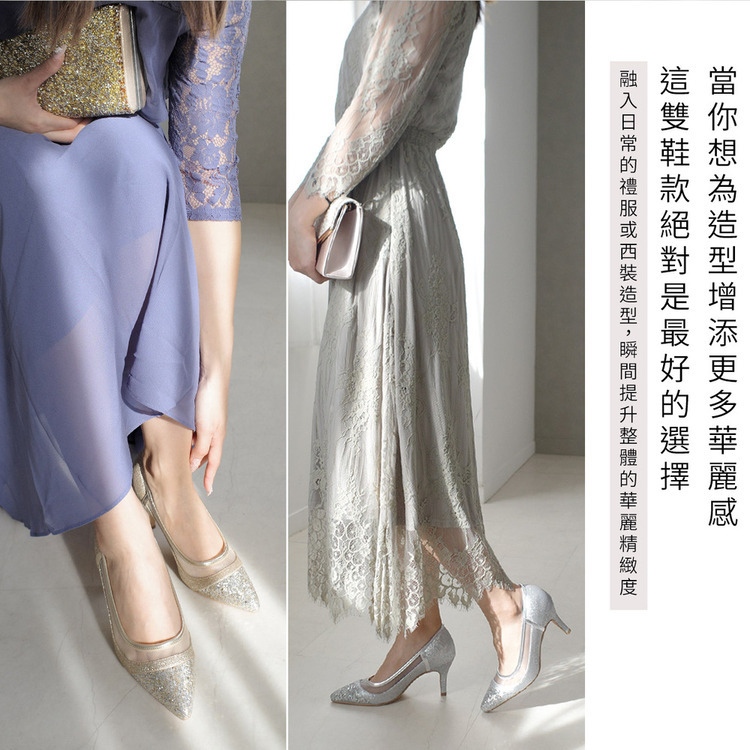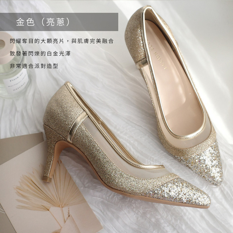 健步如飛系列的華麗亮蔥設計! 一雙精緻的鞋款,搭配不同質感的亮蔥和薄紗,從每個角度看都閃閃發光。