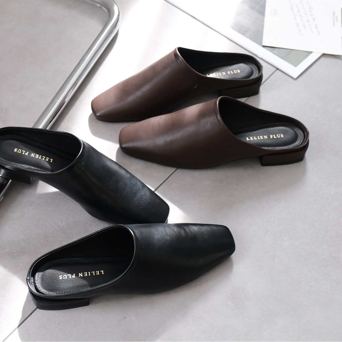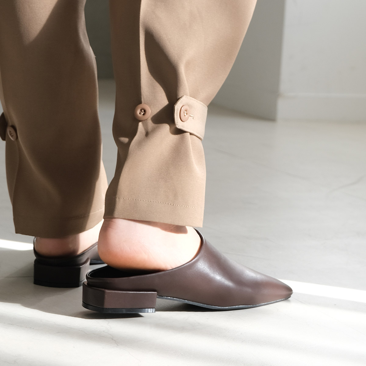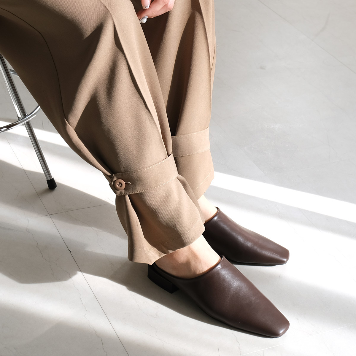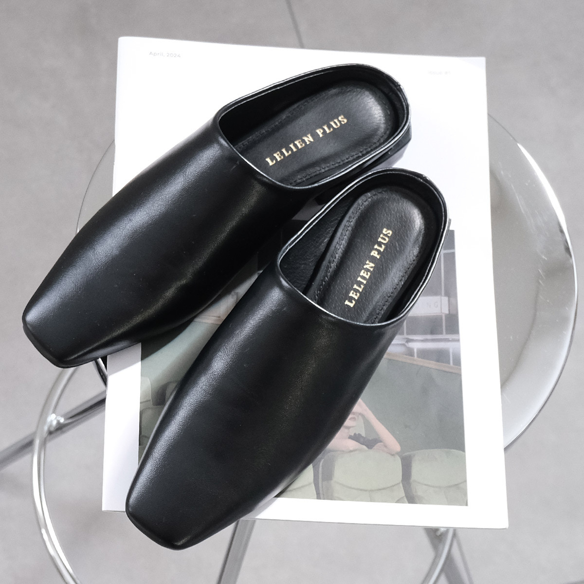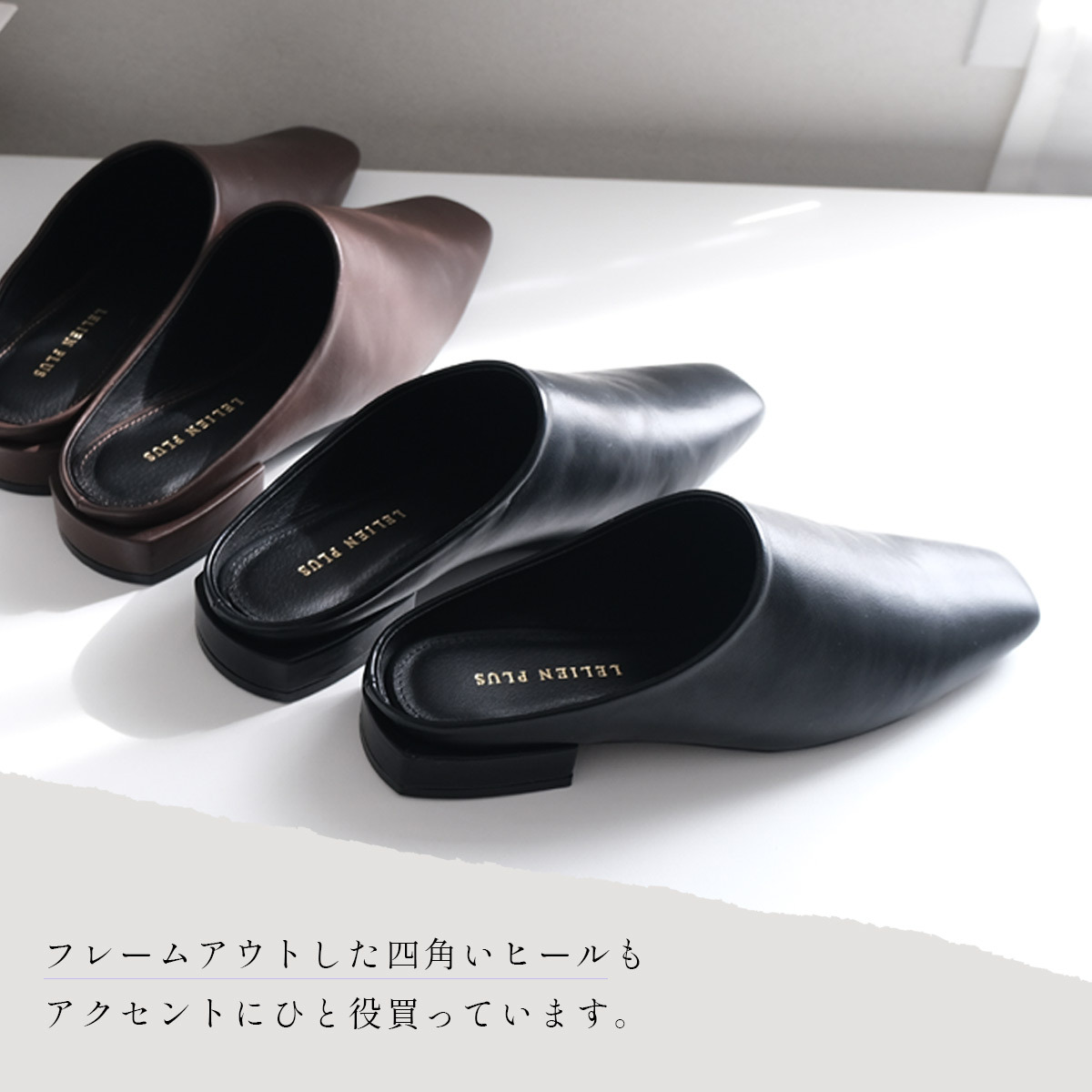 長尖頭設計的方頭穆勒鞋。突出鞋跟邊框的方形設計也是亮點之一。