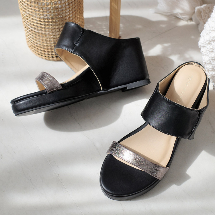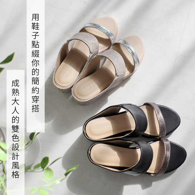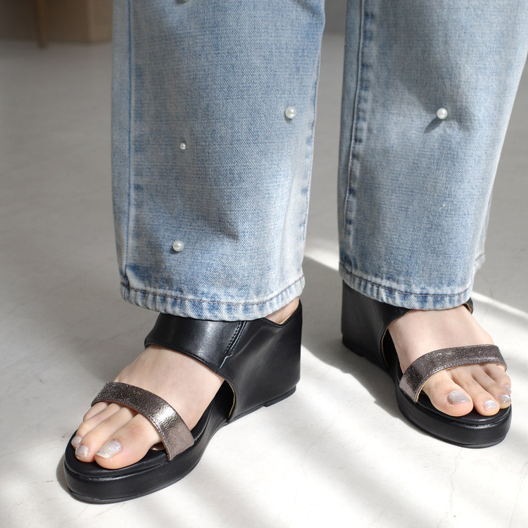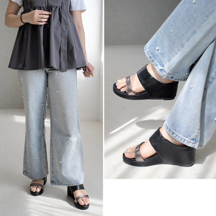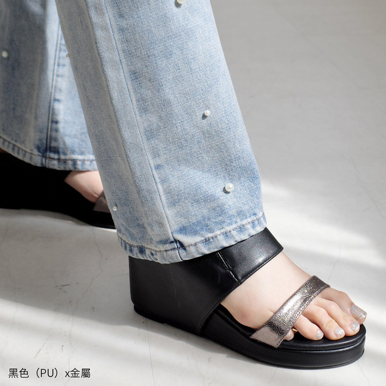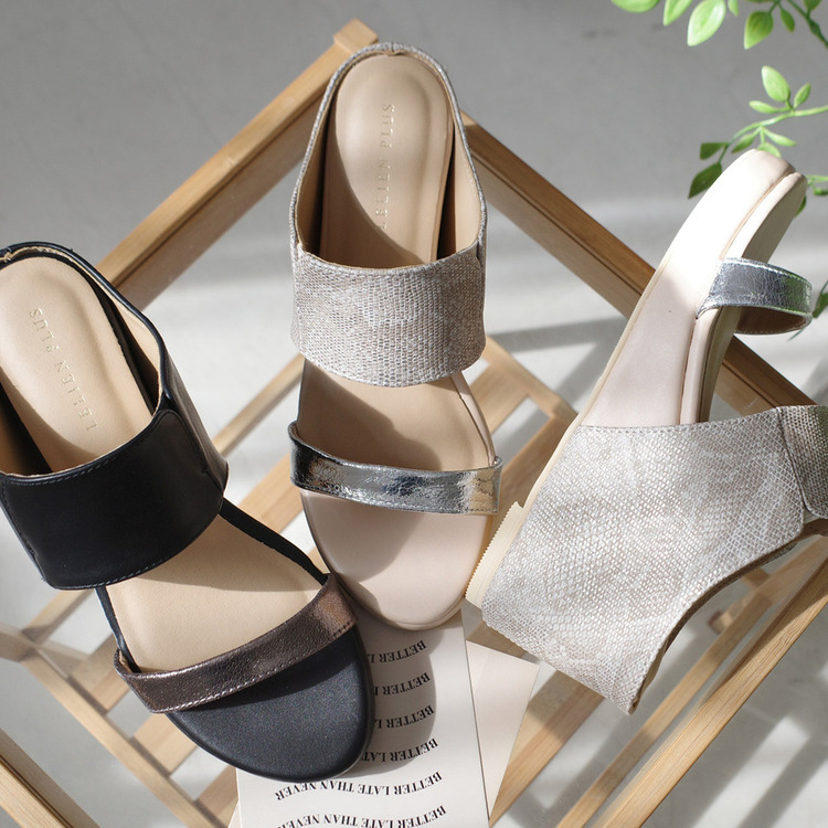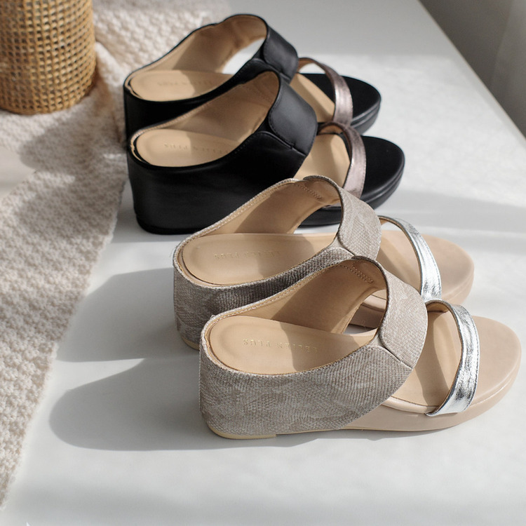 8公分高的坡跟涼拖鞋,儘管鞋跟很高,走起來卻意外地輕鬆穩健,讓你的腿部比例再拉長。