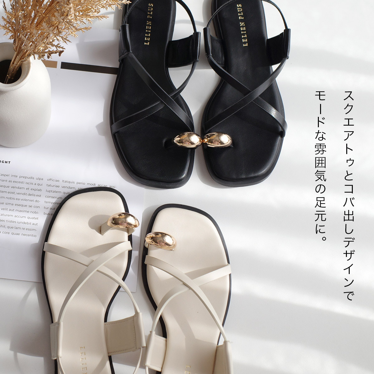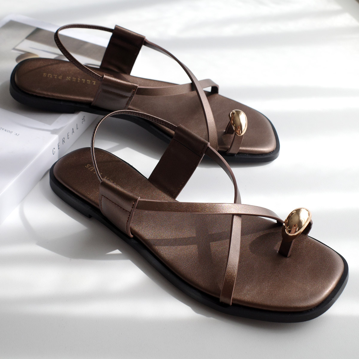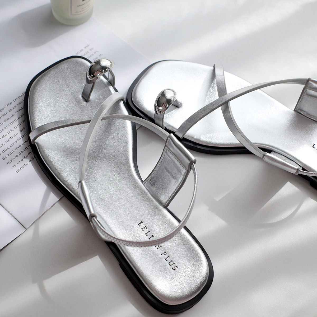 彈性鞋帶設計,輕鬆一套即穿!交叉帶涼鞋搭配金色、銀色的腳趾環設計,為夏日穿搭增添成熟休閒感,讓雙足閃耀亮眼。