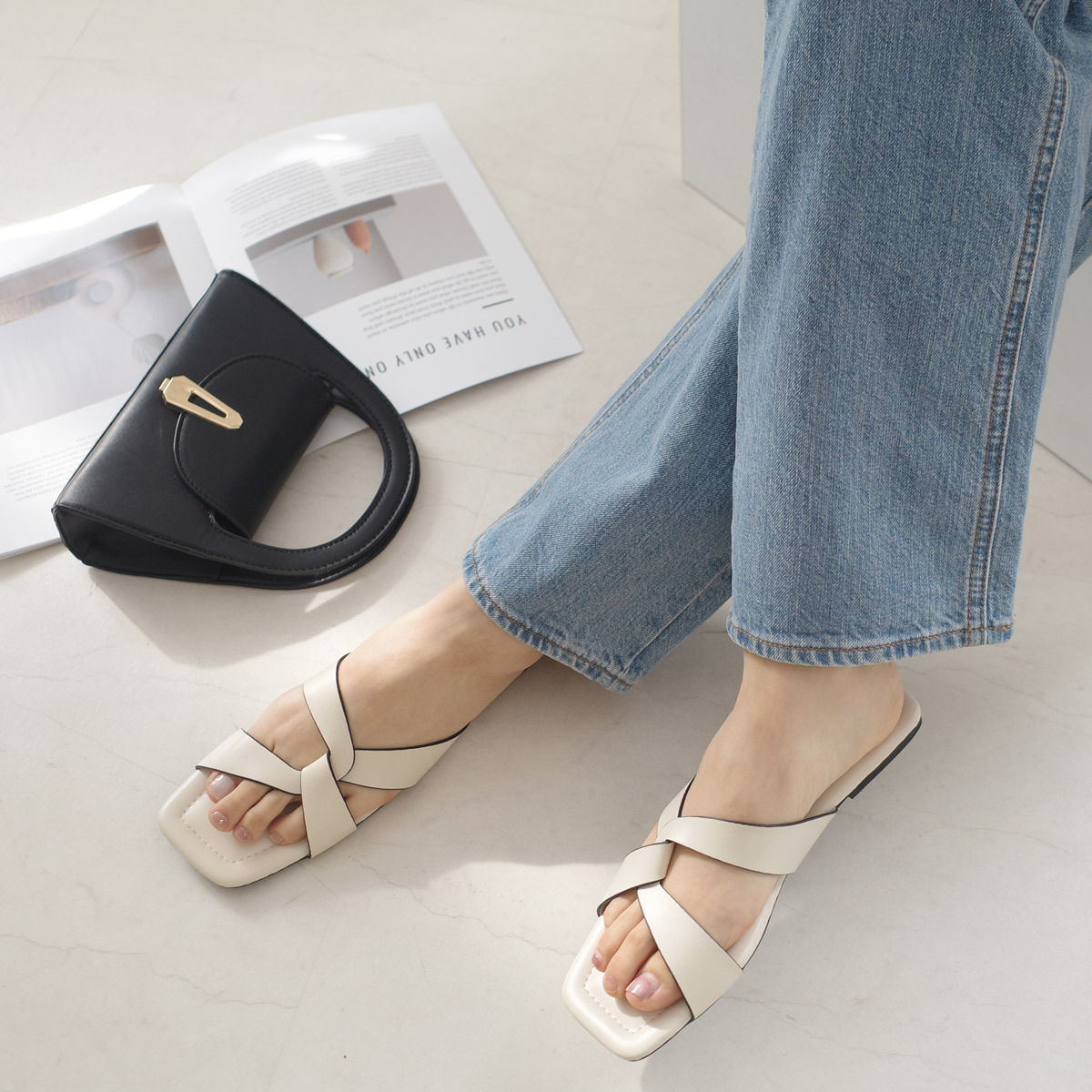 時尚的方頭平底涼鞋,外型粗曠時尚,非常適合夏季穿搭。無論是在城市或是在渡假勝地,都適合。