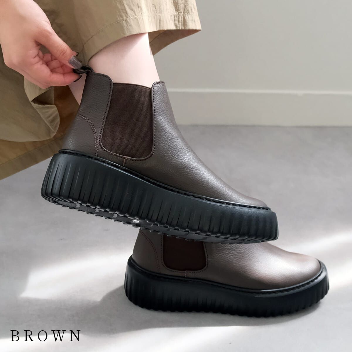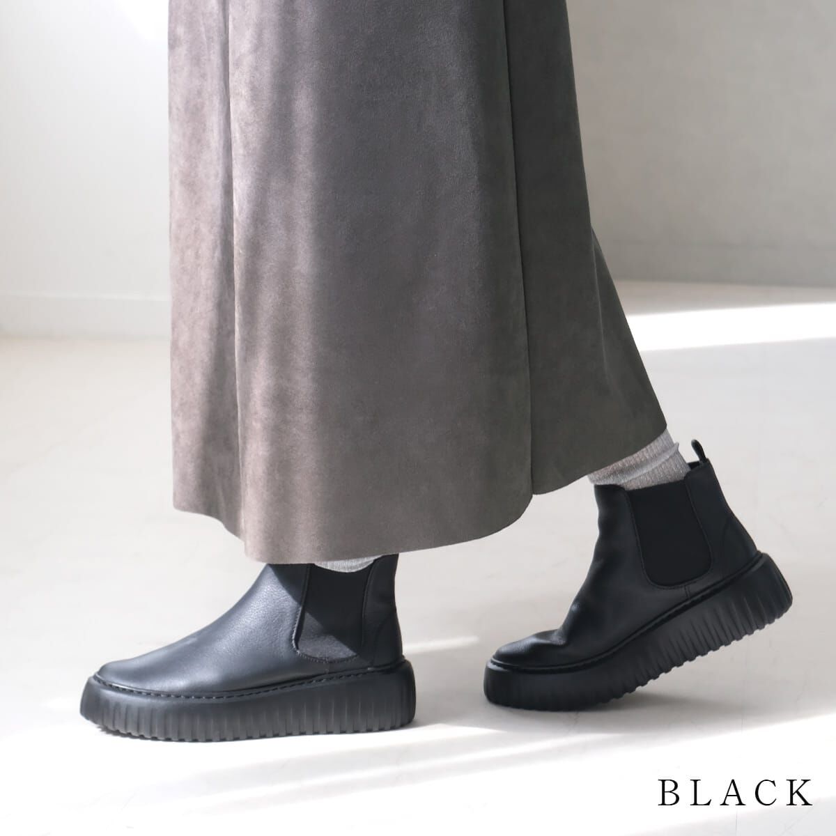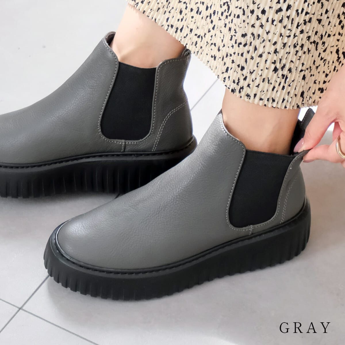 將經典側鬆設計與流行厚底結合的短靴,造型俐落百搭。