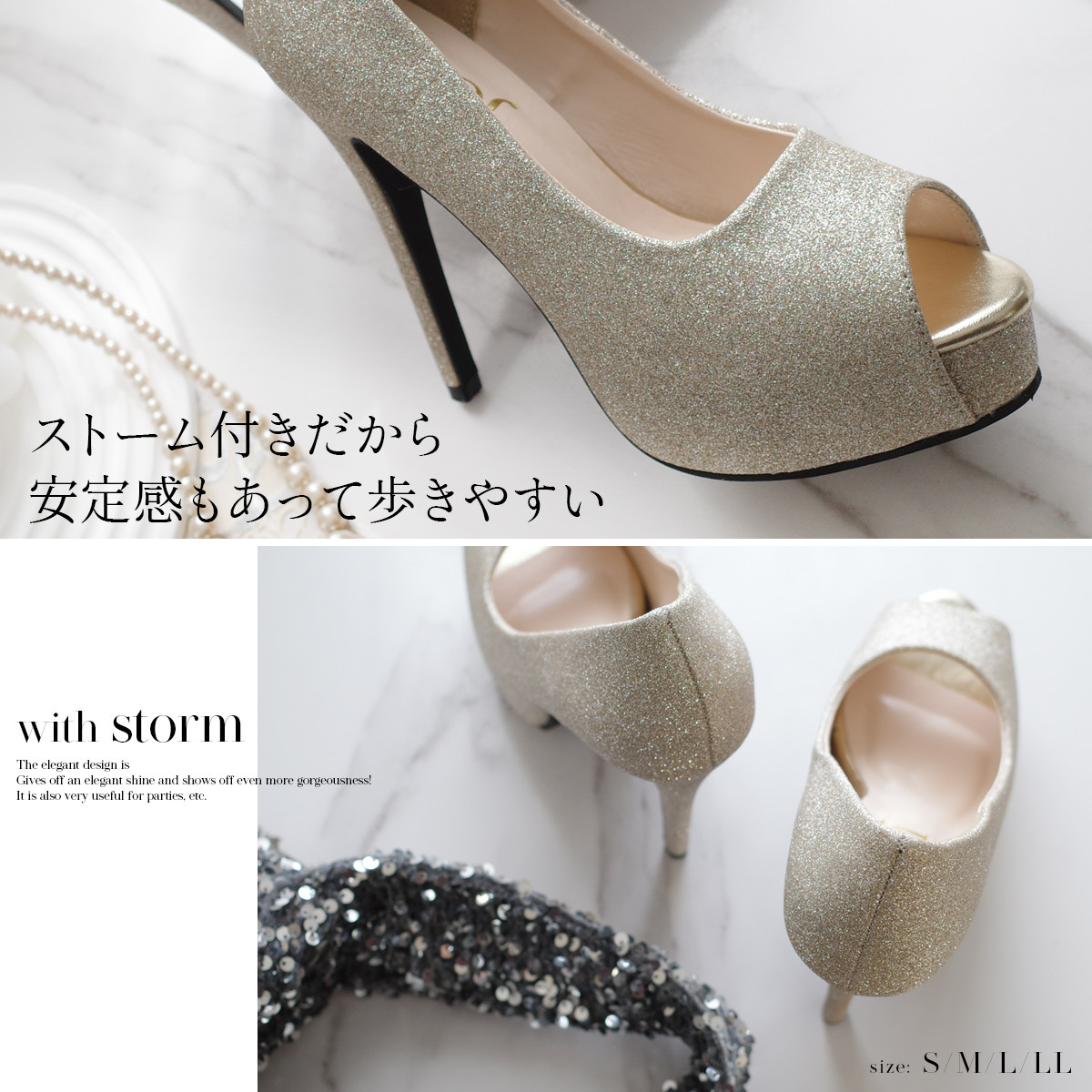 試穿尺寸[S] / 赤腳試穿 全体的に大きいです。オープントゥでヒールが高Inoで、足が前にいく分余計にかかとが余ります。 |