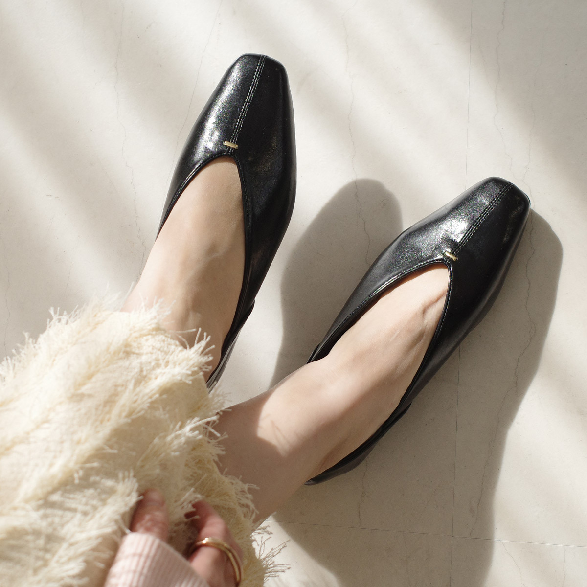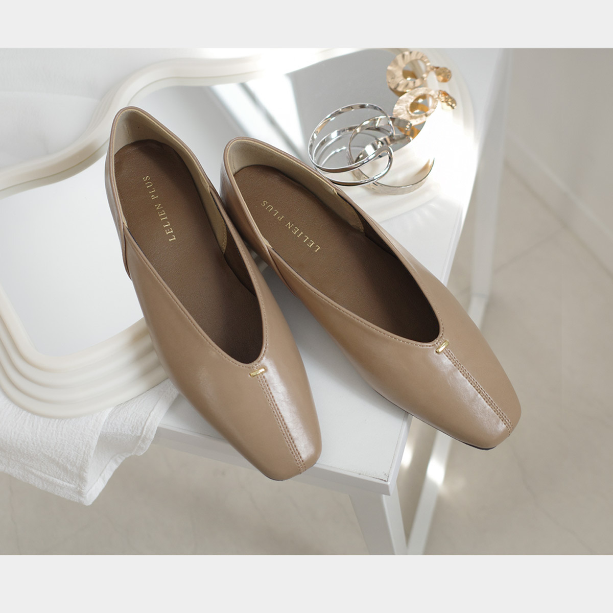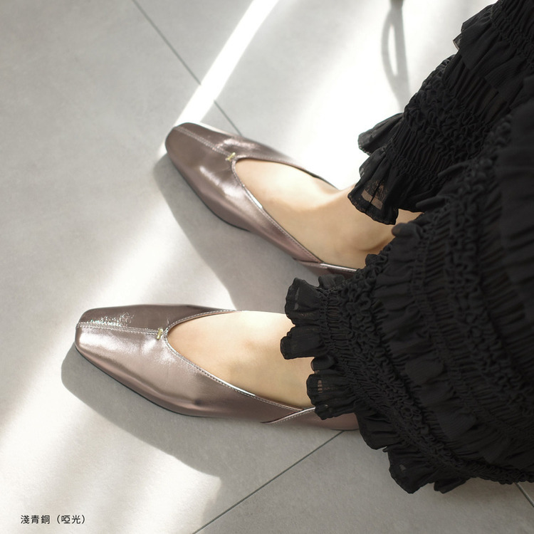 柔軟舒適的平底鞋,方型鞋頭搭配中縫線與金飾,打造低調的老錢風格。