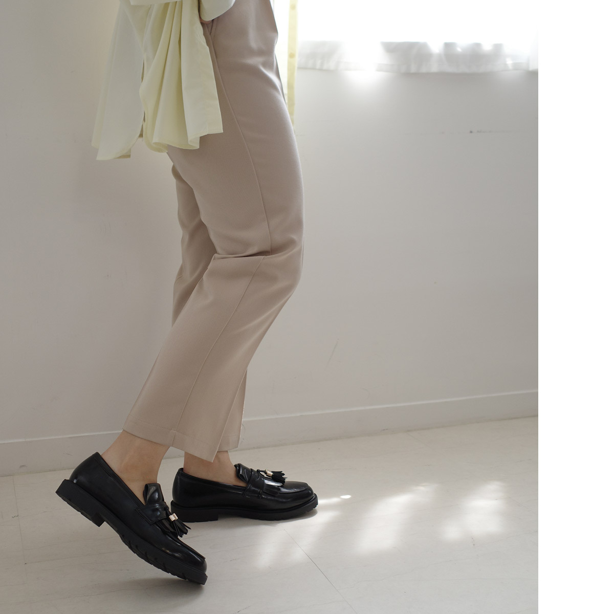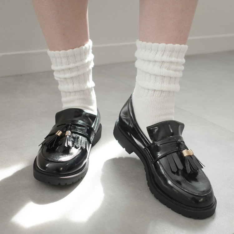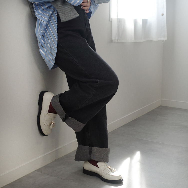 試穿尺寸[M] / 加襪試穿 足入れ出来ますが、全体的に小さめです。 試穿尺寸[L] / 加襪試穿 ≪我選這個尺寸!≫ 長さも幅も丁度良くぴったりと履けます。 生地が柔らかInoで馴染みそうですし、タッセルつけ外しで印象を変えられるのが便利です。