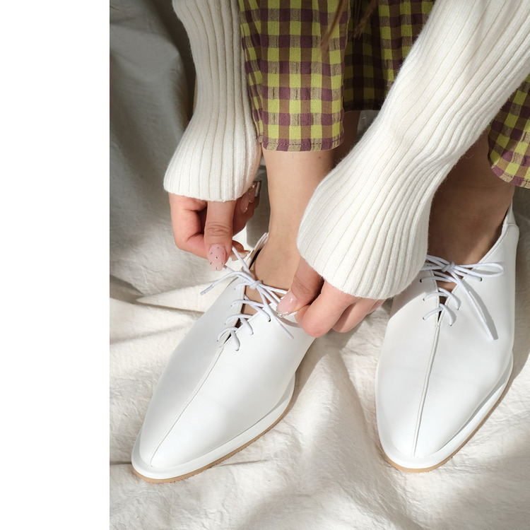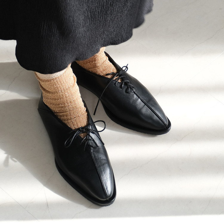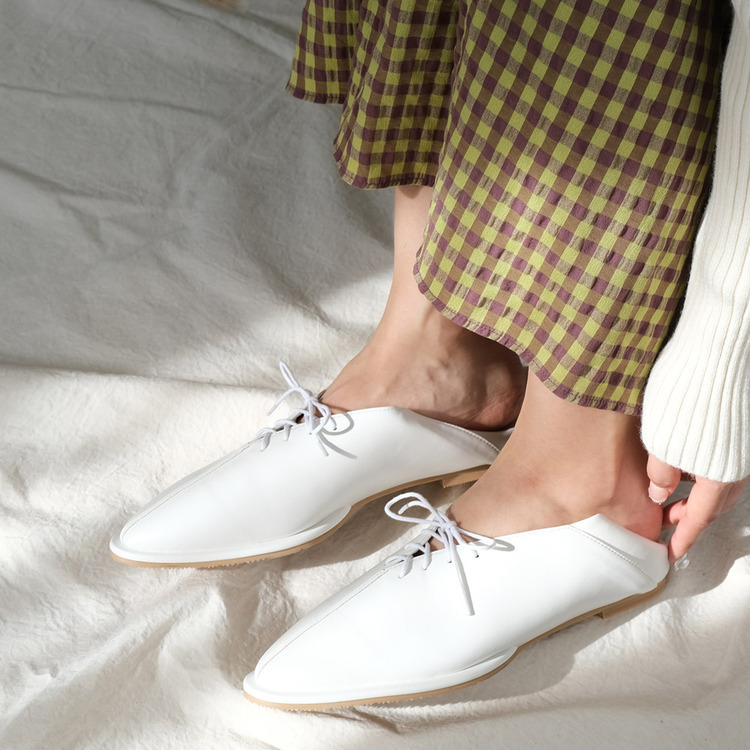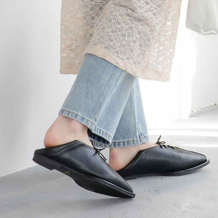 柔軟面料的綁帶鞋,鞋跟可踩設計,V型剪裁讓穿搭風格變得簡約大方。