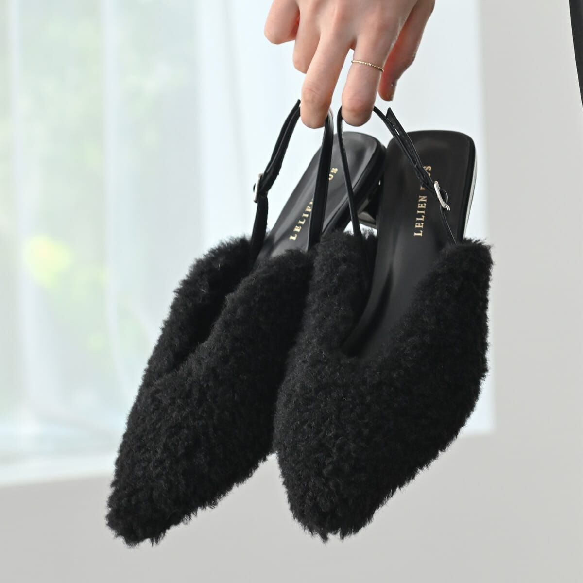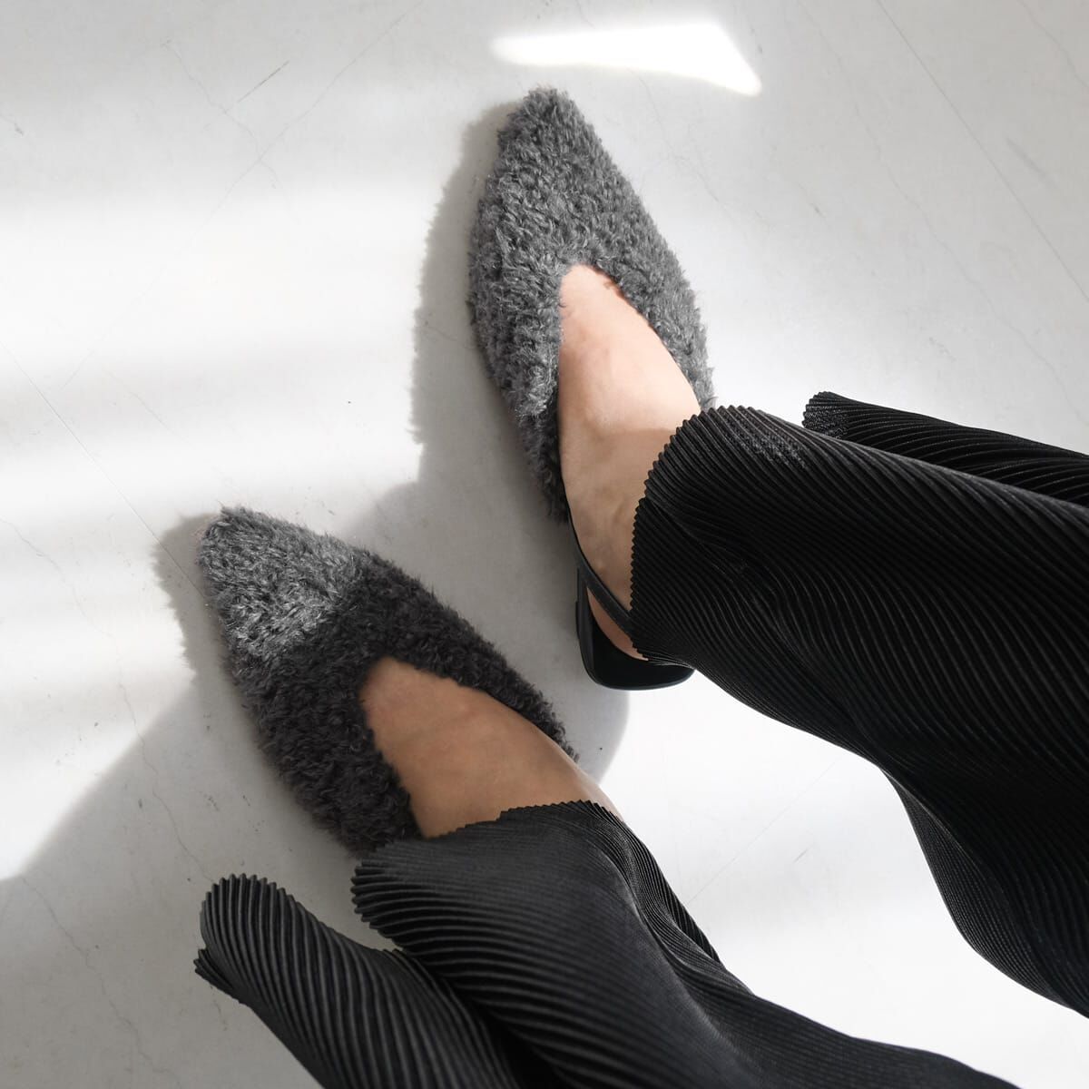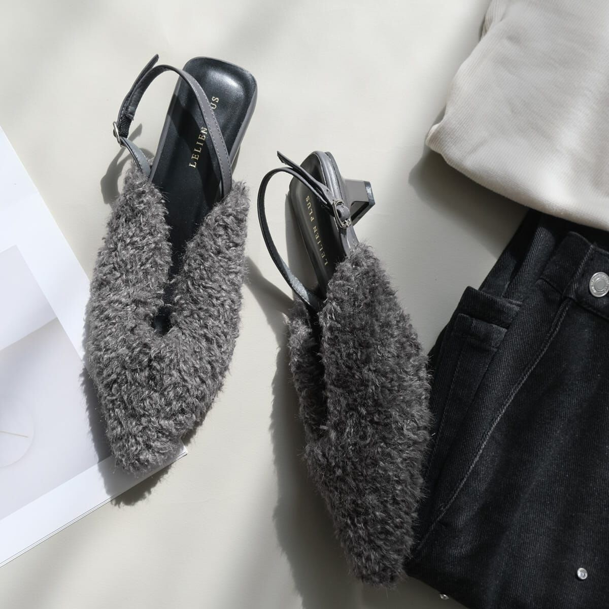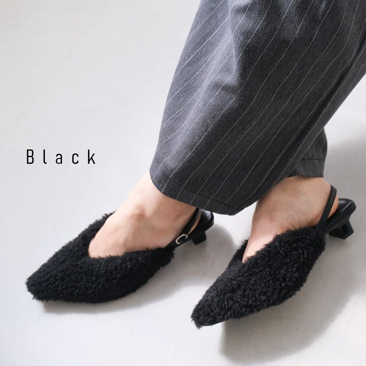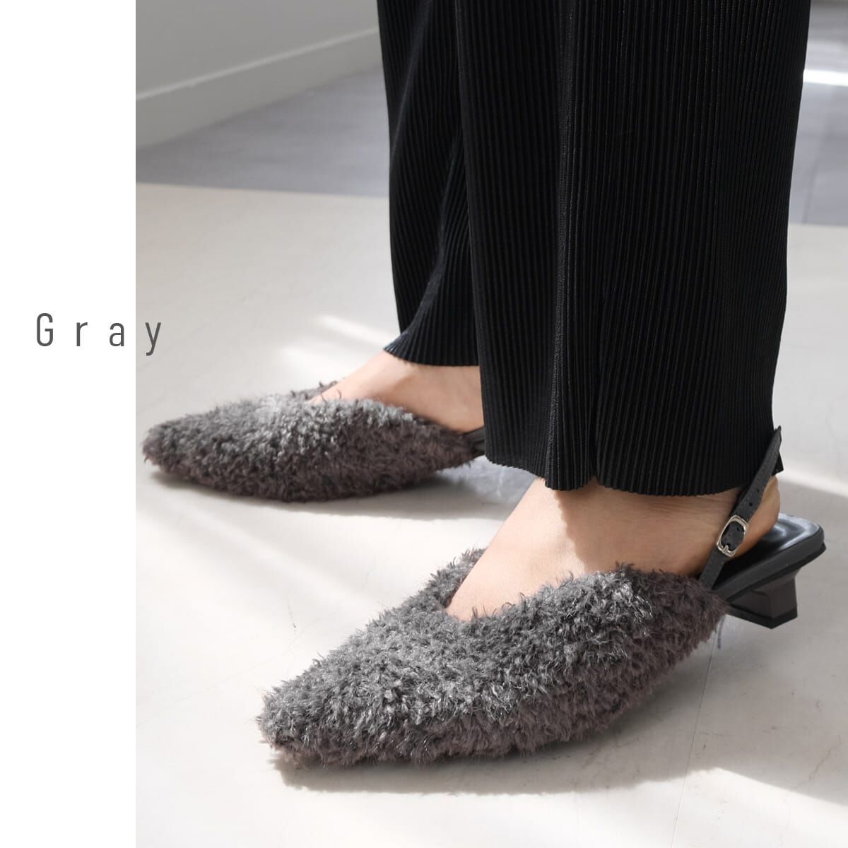 修飾腳型、增添季節感的尖頭穆勒跟鞋。