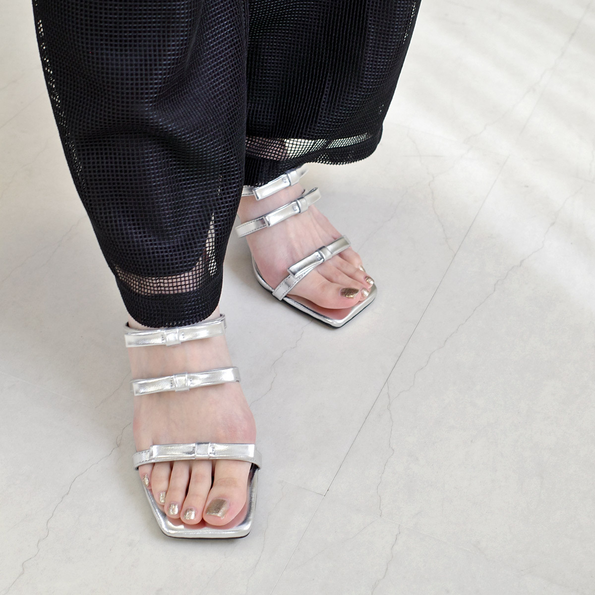 試穿尺寸[S] / 赤腳試穿 一番手前のストラップはゆるいですが、かかとがちょうどよくおさまります。 |