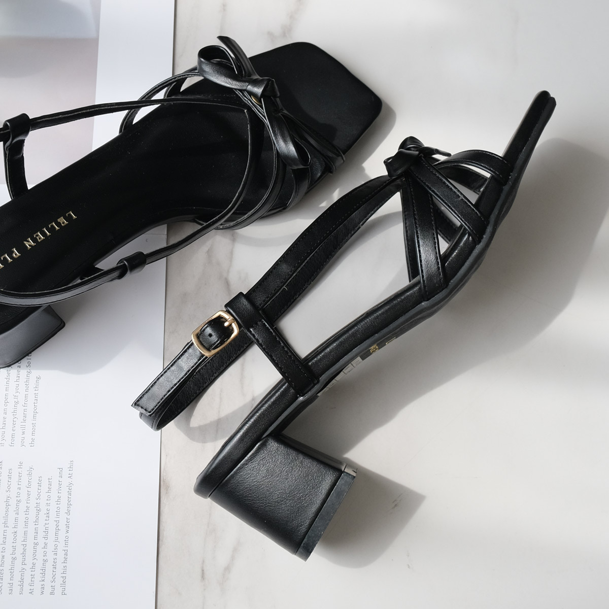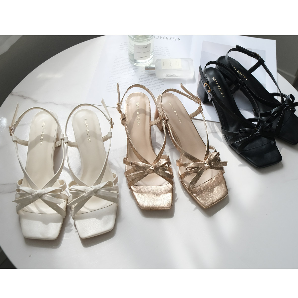 細緻的繫帶搭配蝴蝶結作為點綴的涼鞋,結合方頭與粗跟設計,不會過於甜美,展現出自然不造作的時尚感。